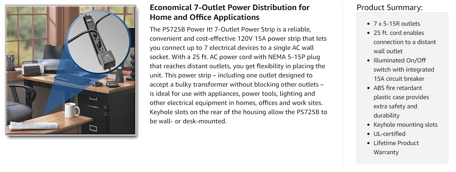 The PS725B is backed by a Lifetime Warranty. As part of Tripp Lite’s commitment to environmental responsibility, it is manufactured in compliance with strict RoHS specifications.
