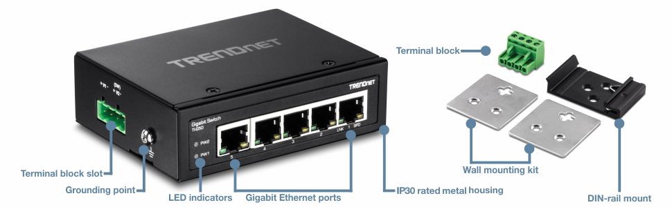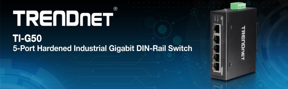 TRENDnet's TI-G50 is a reliable IP30 unmanaged DIN-rail switch with hardened components rated for extreme industrial environments. It offers 5 Gigabit ports and a 10 Gbps switching capacity. Redundant power inputs (power adapter sold separately: TI-M6024) with overload current protection support zero downtime applications.
