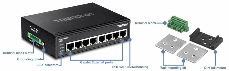 TRENDnet's TI-G80 is a reliable IP30 unmanaged DIN-rail switch with hardened components rated for extreme industrial environments. It offers 8 Gigabit ports and a 16 Gbps switching capacity. Redundant power inputs (power adapter sold separately: TI-M6024) and a power failure alarm output trigger support zero downtime applications.