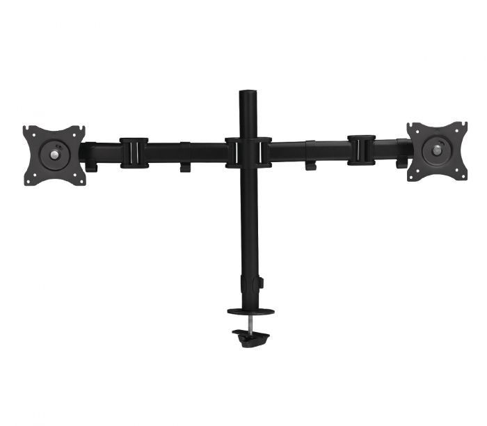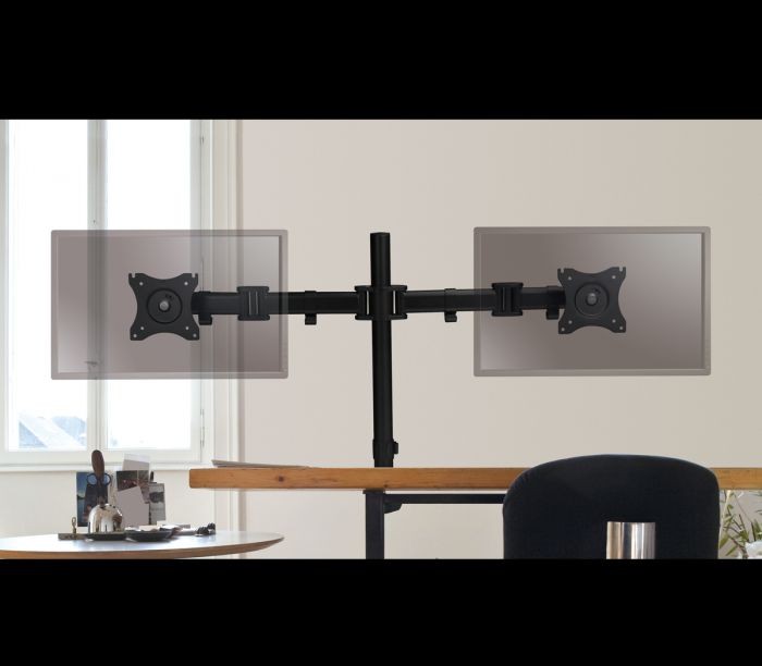 Articulating desk mount holds two flat panel monitors from 13" to 27" with weight capacity up to 17lbs each