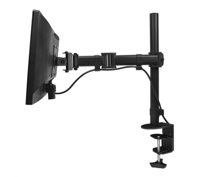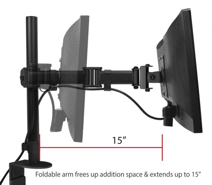 360° rotatable VESA plate supports portrait or landscape monitor orientation, foldable arm frees up additional space and extends up to 15", mounting pole allows height adjustment up to 17"