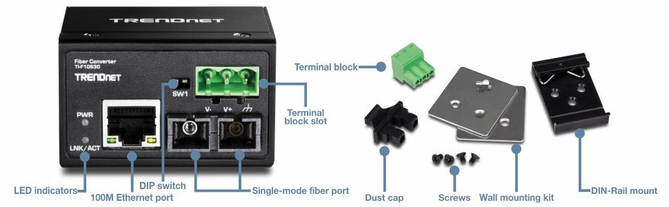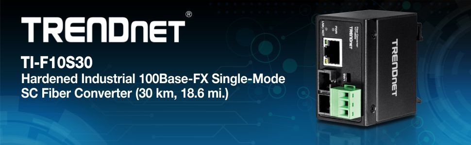 TRENDnet’s TI-F10S30 is a compact IP40 rated 100Base-FX fiber converter with hardened components rated for extreme industrial environments. It accommodates long distance networking with 100Base-FX Single-Mode fiber over distances of up to 30 km (18.6 miles). Both DIN-rail and wall mount hardware is included. Power supply sold separately: model TI-M6024.