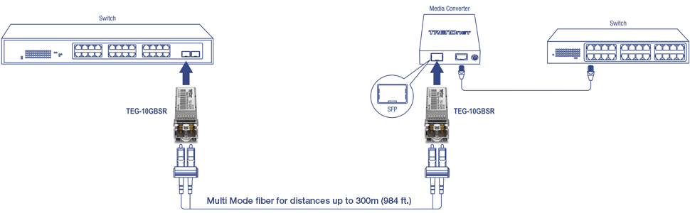 Multi Mode transceiver spans distances up to 300m (984 ft.) and supports up to 10.5 Gbps throughput speeds.