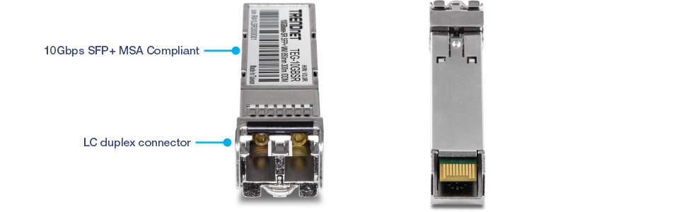 TRENDnet’s hot-pluggable 10GBASE-SR SFP+ Multi Mode LC Module, model TEG-10GBSR, works with an MSA compliant SFP+ slot. This Multi Mode transceiver spans distances up to 300m (984 ft.), comes with a LC duplex connector, and supports up to 10.5 Gbps networking throughput speeds. Digital Diagnostics Monitoring (DDM) captures critical device parameters, such as transmit/receive power, temperature, and voltage.