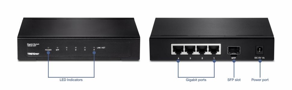 TRENDnet's metal housing 4-Port Gigabit Switch with SFP Slot, model TEG-S51SFP, provides performance, proven reliability, and flexible extension of your Gigabit network. This fanless unmanaged desktop switch offers a total switching capacity of 10 Gbps combined with the flexibility of fiber networking. 802.1p QoS maintains your voice and video priority throughout the network. Magnetic mounting kit for easy and flexible setups.
