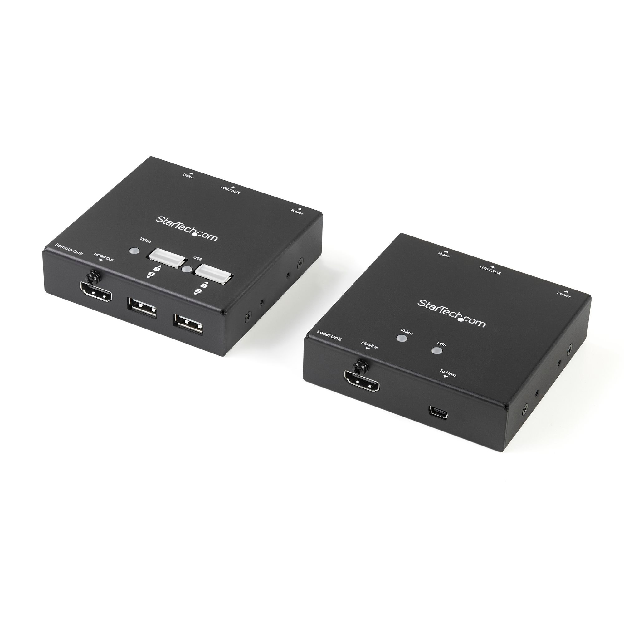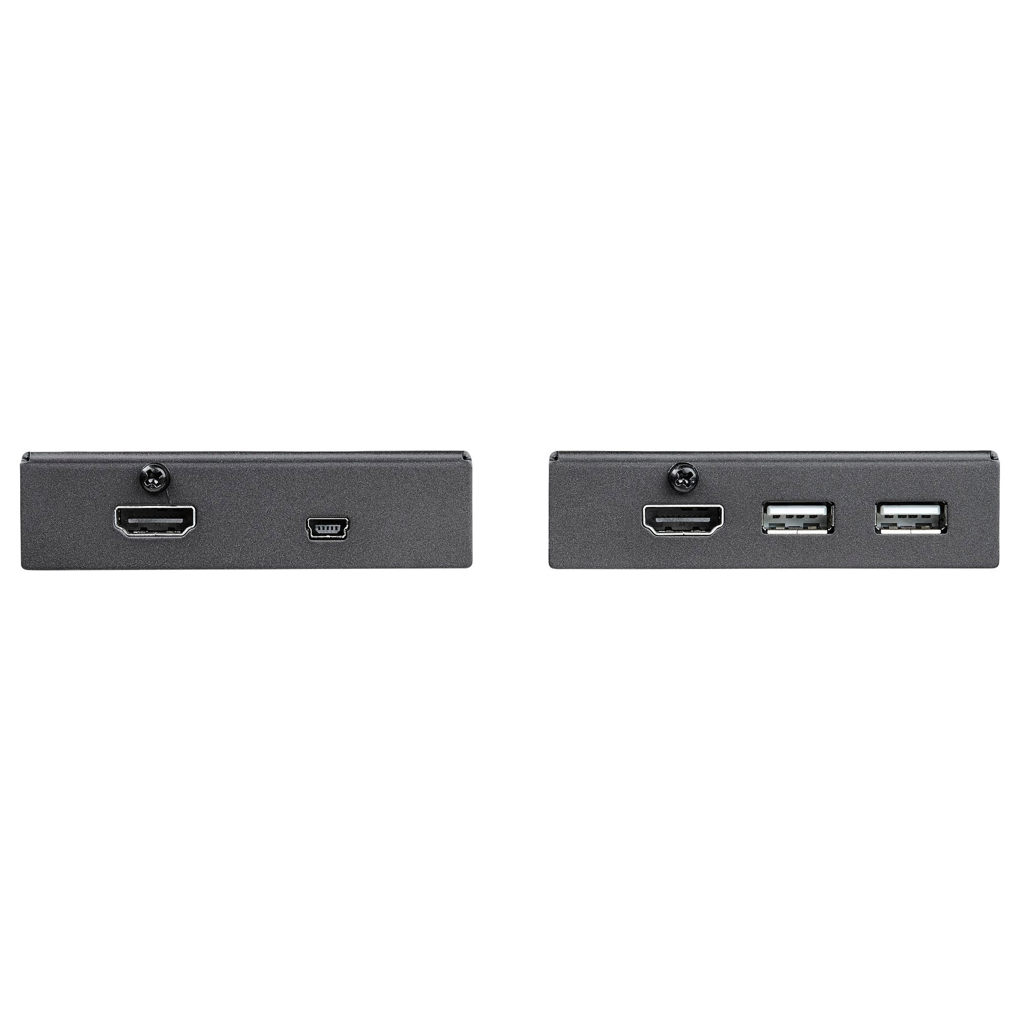 This HDMI® extender kit lets you transmit your HD video source to your remote HDMI display at a distance of up to 165 ft. (50 m) away. 1080p video can be extended 131 ft. (40 m) using shielded CAT 6 cabling. The extender features a built-in 4-port USB 2.0 hub that also lets you connect four remote USB peripheral devices at your display location.