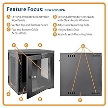 The SRW12USDPG swings away from the wall on a sturdy hinge, allowing easy back-door access to equipment and cabling during installation and maintenance. The reversible doors can open left or right by rotating the cabinet 180 degrees before mounting. The side panels and doors lock securely to help prevent damage, tampering or theft. Convenient top and bottom ports allow easy cable routing.