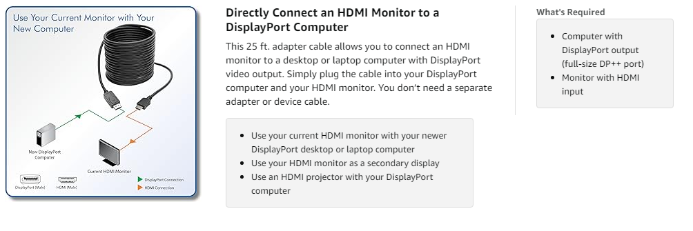 This passive adapter cable helps you save money by making your current HDMI monitor compatible with a DisplayPort-equipped computer. High-quality connectors provide maximum conductivity to ensure a clean, consistent video signal.