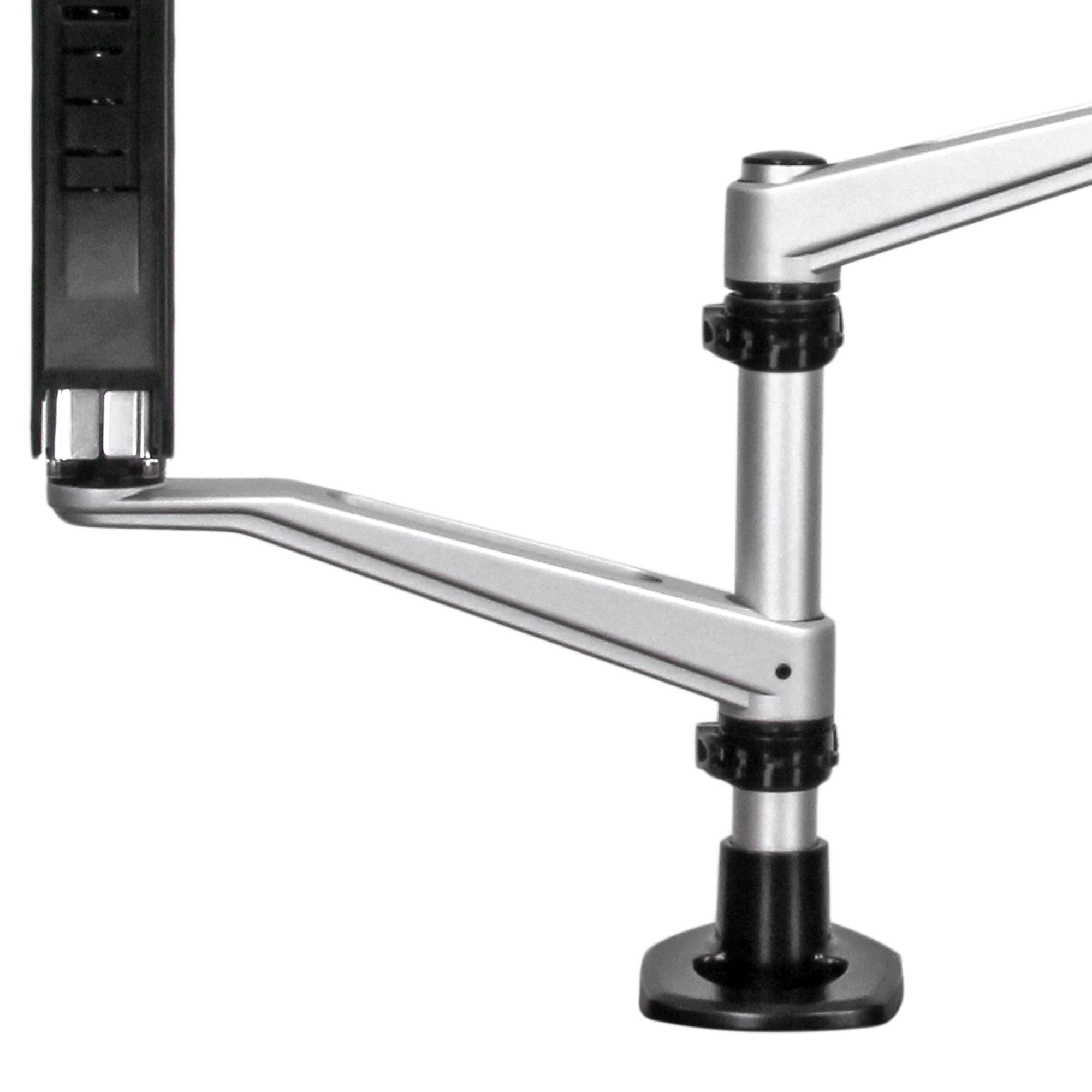 The adjustable dual monitor arm offers a full range of motion on several axes, letting you tilt, pan and rotate. Switch from landscape to portrait viewing.