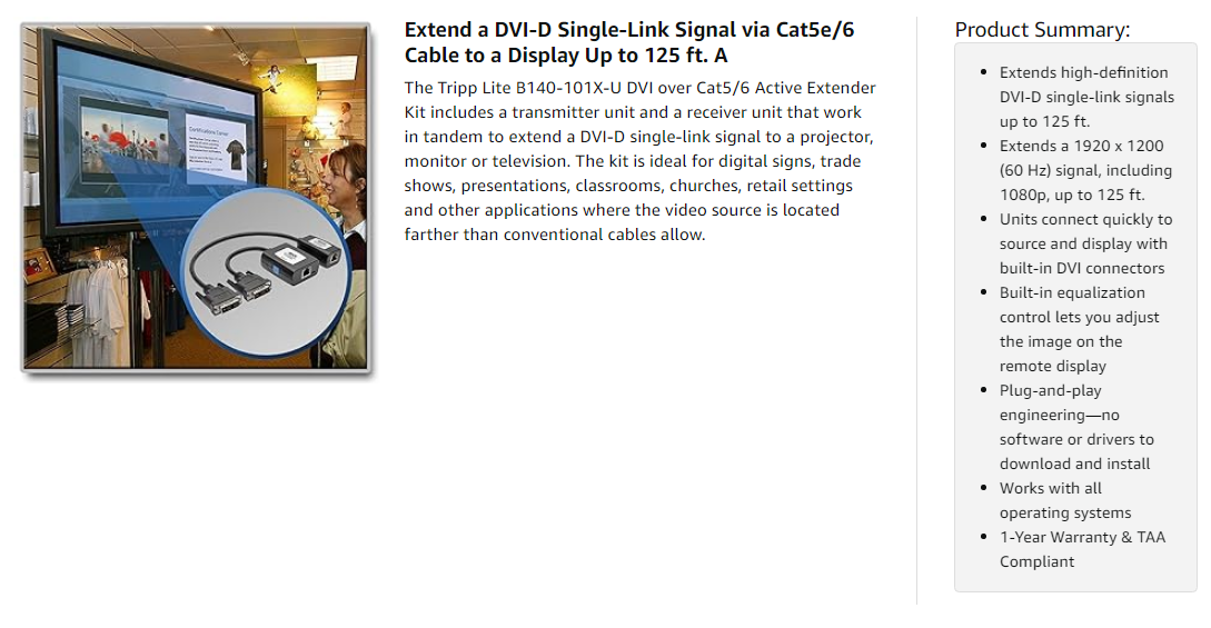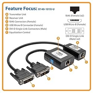 The HDCP-compatible B140-101X-U can extend a 1920 x 1200 (60 Hz) signal, including 1080p, up to 125 feet. LEDs on the RJ45 ports indicate when the units are receiving power and a DVI signal from the source. Built-in equalization control lets you fine-tune the image on the remote display. Easy to set up with no software or drivers to install, the B140-101X-U is compatible with all operating systems.