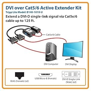 Both the transmitter and receiver feature a built-in DVI-D cable for connecting to your computer’s DVI output port and the display’s DVI input port. Cat5e/6 cable connects the two units (for best results, use 24 AWG solid-wire Cat5e/6 cable, such as Tripp Lite’s N202-Series). An included USB Micro-B cable connects the receiver and a USB port on the display or a USB wall charger to supply power to the unit.