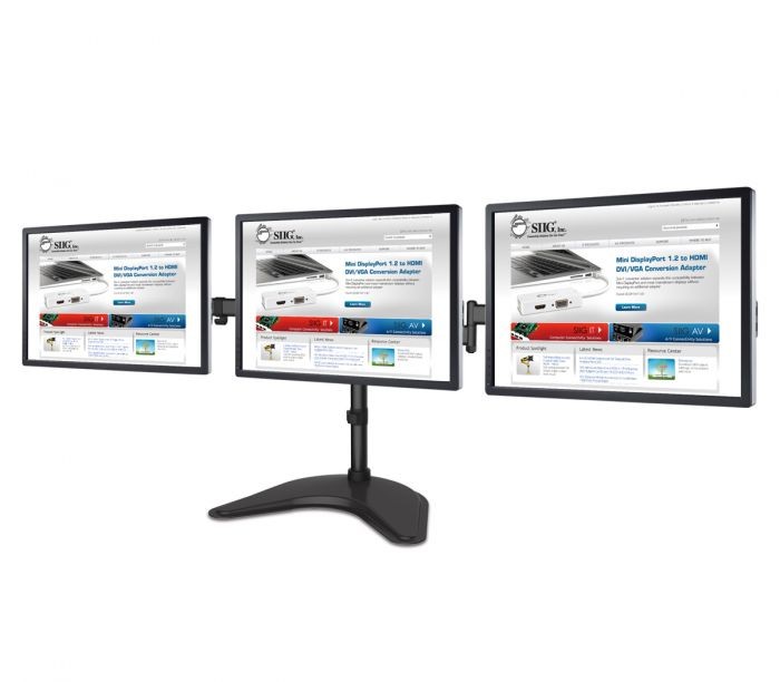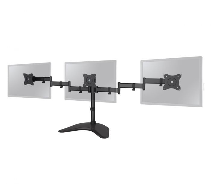 Full-motion side-by-side triple monitor desk stand conserves valuable desk spac