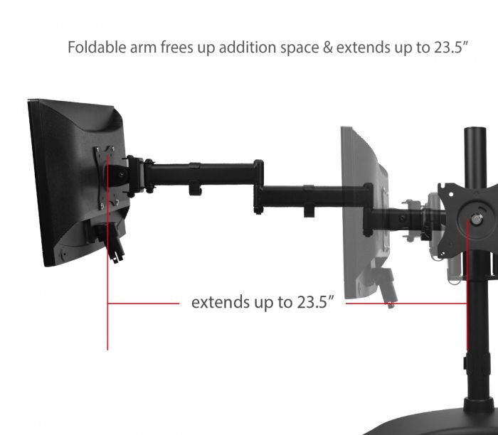 360° rotating VESA plate supports portrait or landscape monitor orientation, articulating/folding arms free up additional space and extends up to 24.8"