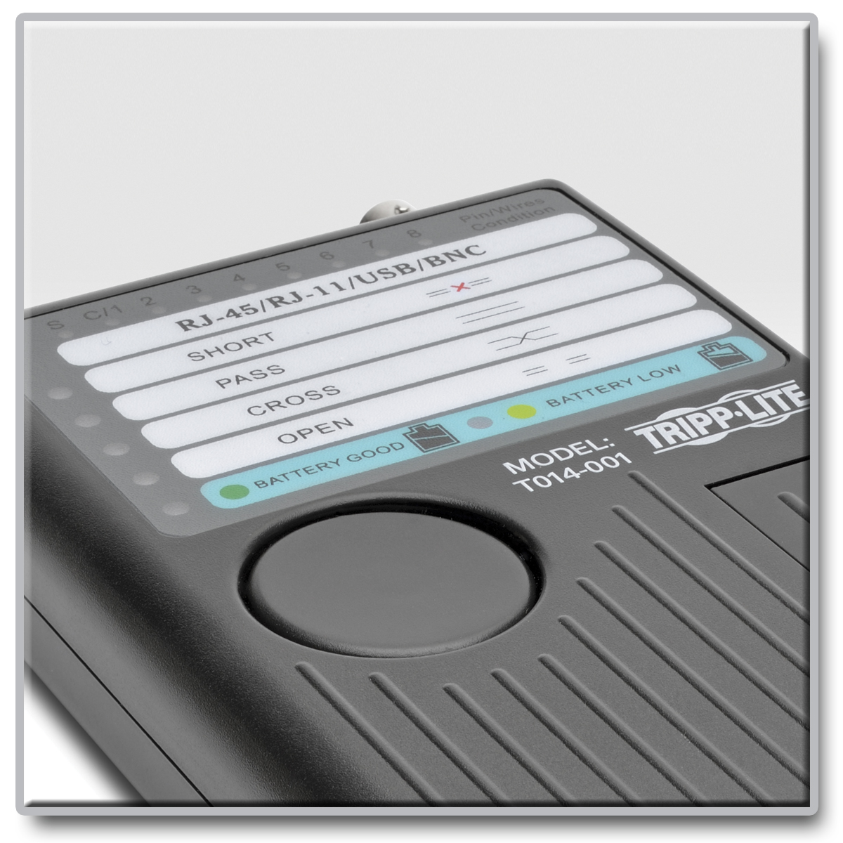A BNC to RJ11 jumper cable is included for testing BNC cable. When not in use, the two-piece T014-001 can be stored in its handy carrying case. Battery status LEDs let you know when the user-supplied 9V battery needs to be replaced.