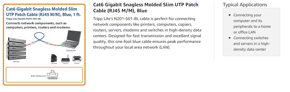 Manufactured from 28 AWG copper wire, the four-pair stranded UTP N201-S01-BL delivers speeds up to Cat6 Gigabit/1 Gbps. RJ45 male connectors guarantee an accurate signal transfer. The snagless design protects the locking tabs against being damaged or broken off during installation. Integral strain relief ensures the cable and connectors last a long time.