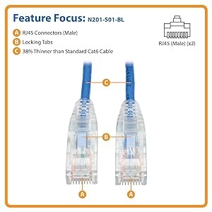 Protected by a PVC jacket, the N201-S01-BL is more than 38% smaller in diameter than standard Cat6 cable, which increases airflow in tight spaces and makes it easier to install around corners and through cable management panels.