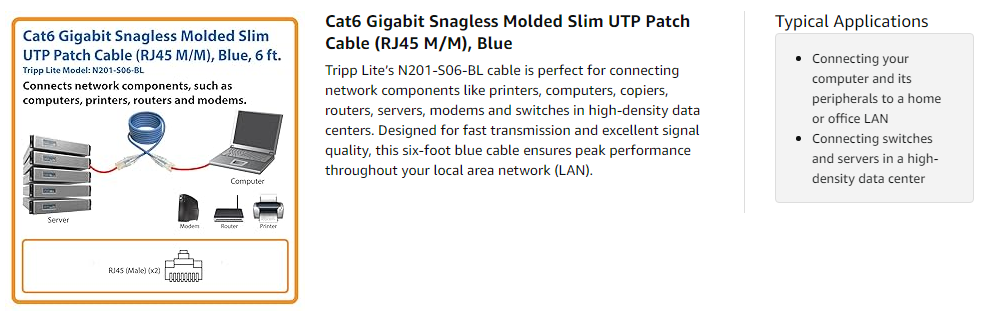 Manufactured from 28 AWG copper wire, the four-pair stranded UTP N201-S06-BL delivers speeds up to Cat6 Gigabit/1 Gbps. RJ45 male connectors guarantee an accurate signal transfer. The snagless design protects the locking tabs against being damaged or broken off during installation. Integral strain relief ensures the cable and connectors last a long time.