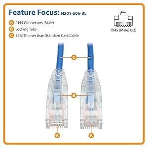 Protected by a PVC jacket, the N201-S06-BL is more than 38% smaller in diameter than standard Cat6 cable, which increases airflow in tight spaces and makes it easier to install around corners and through cable management panels.