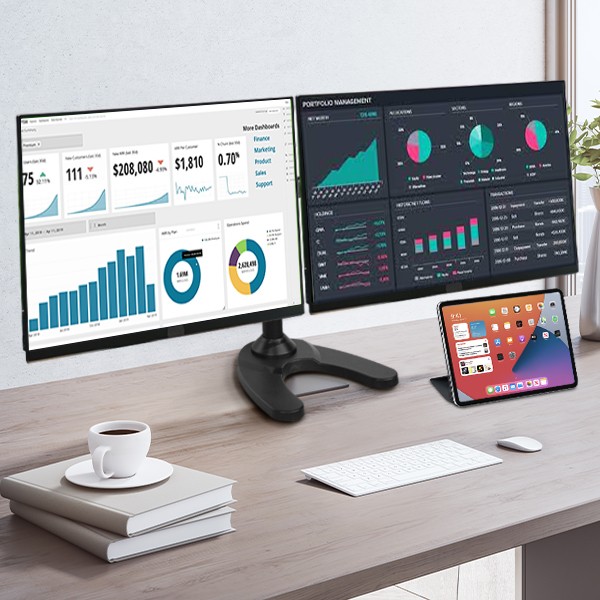 Dual monitor desk stand fits 13" to 27" monitors up to 22Ibs in weight with VESA 75x75mm or 100x100mm mounting holes