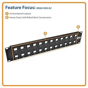 Made from heavy-duty cold-rolled steel, the N062-024-KJ mounts easily into 1U of an EIA-standard 19-inch two-post rack or wall-mount rack enclosure using the included hardware. Grounding wire is also included.