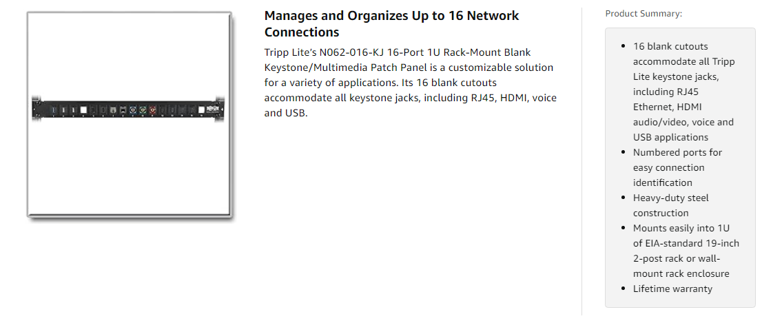 Made from heavy-duty cold-rolled steel, the N062-016-KJ mounts easily into 1U of an EIA-standard 19-inch two-post rack or wall-mount rack enclosure using the included hardware. Grounding wire is also included.