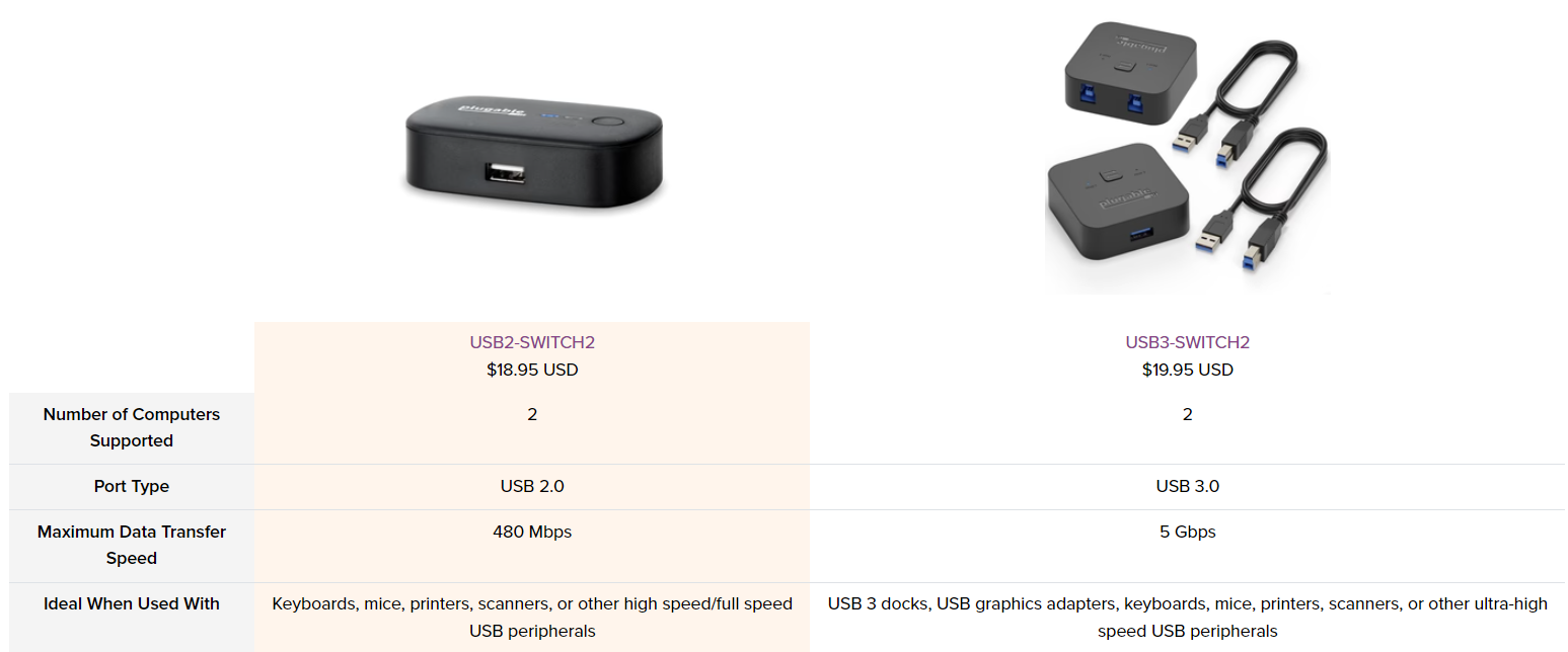The Plugable USB 2.0 Sharing Switch (USB2-SWITCH2) is the ideal solution for one-touch switching of access between two computers to a: