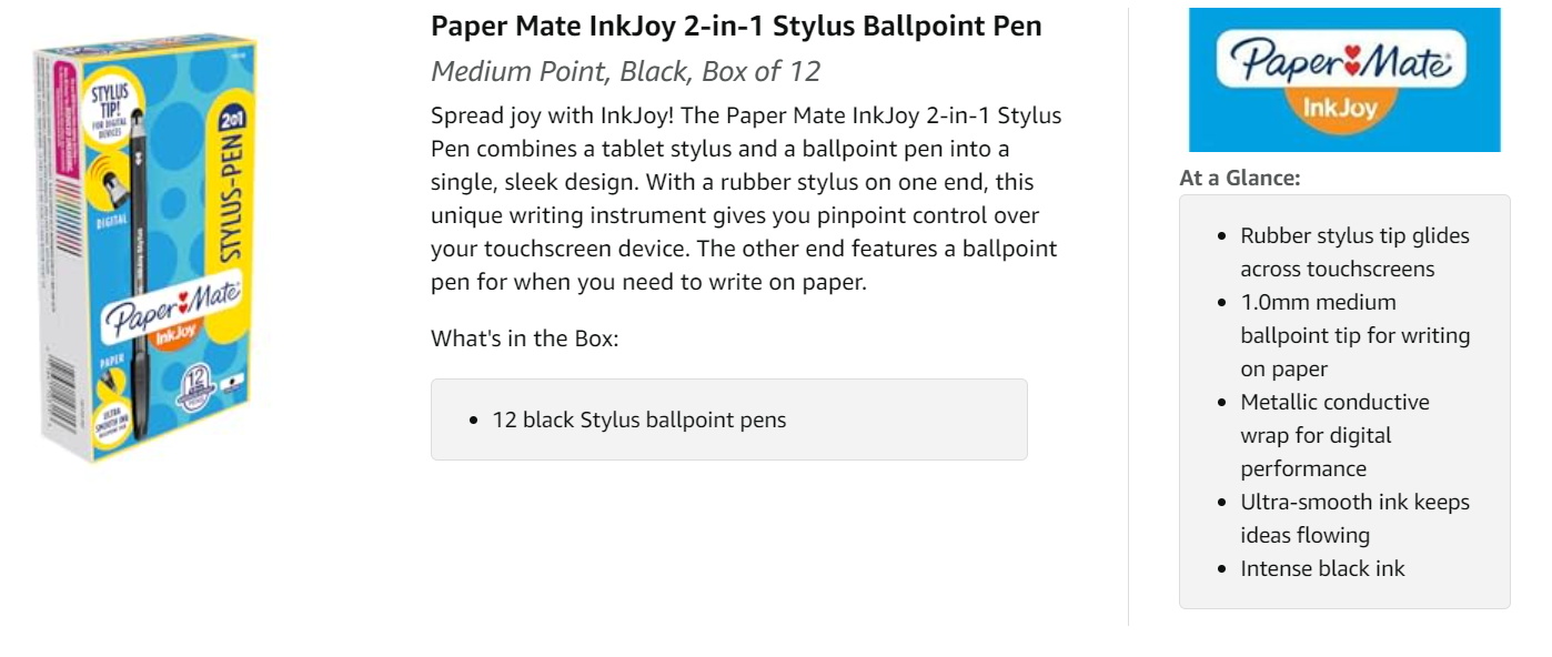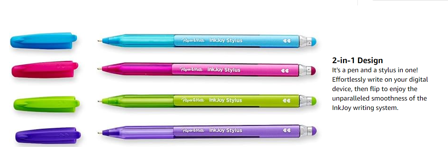 Equipped with the unique InkJoy writing system, each InkJoy 2-in-1 Stylus Pen combines ultra-smooth ink with a writing-optimized ballpoint tip that spreads the ink evenly and reliably. The tip is designed to release ink upon contact with paper, reducing drag. The result is a fluid writing experience that places minimal strain on your hand and keeps the ink--and your thoughts--flowing freely. With Paper Mate InkJoy, there’s nothing to hold you back!