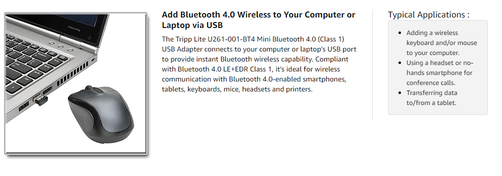 The U261-001-BT4 has a wireless range of 164 feet (50 meters) and supports data transfer rates up to 3 Mbps. It requires very little power to function, and its built-in security ensures pairing, encryption and authentication remains private.