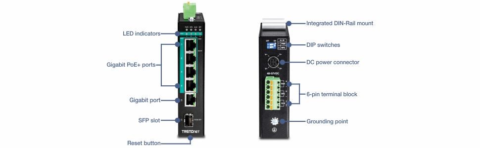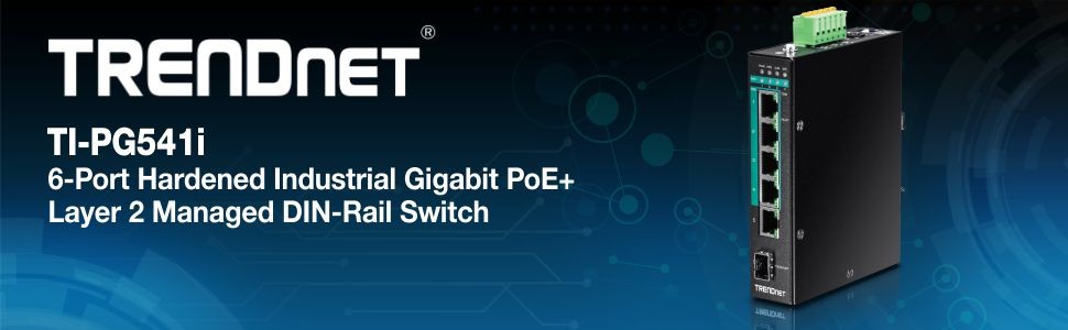 TRENDnet's 6-Port Hardened Industrial Gigabit PoE+ Layer 2 Managed DIN-Rail Switch, model TI-PG541i, has four Gigabit PoE+ ports, one Gigabit port, one Gigabit SFP slot and a 120 Watts PoE budget. The switch is equipped with an IP30 rated metal enclosure and designed to withstand a high degree of vibration, shock, protection against ESD / EMI / surge, and operate within a wide temperature range (- 40 – 75 °C (- 40 - 167 °F)) for harsh environments. L2 management include features such as PoE port control, VLAN, multicast, and QoS which allow for network integration flexibility.