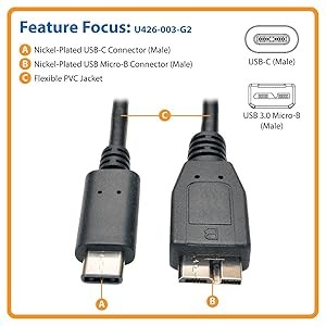 Unlike traditional USB cables that can be plugged in only one way, USB-C connectors are reversible by design. The male USB-C connector plugs into a USB-C port in either direction, eliminating guesswork and providing a fast, easy connection the first time, every time. The connector is also compatible with Thunderbolt 3 ports.