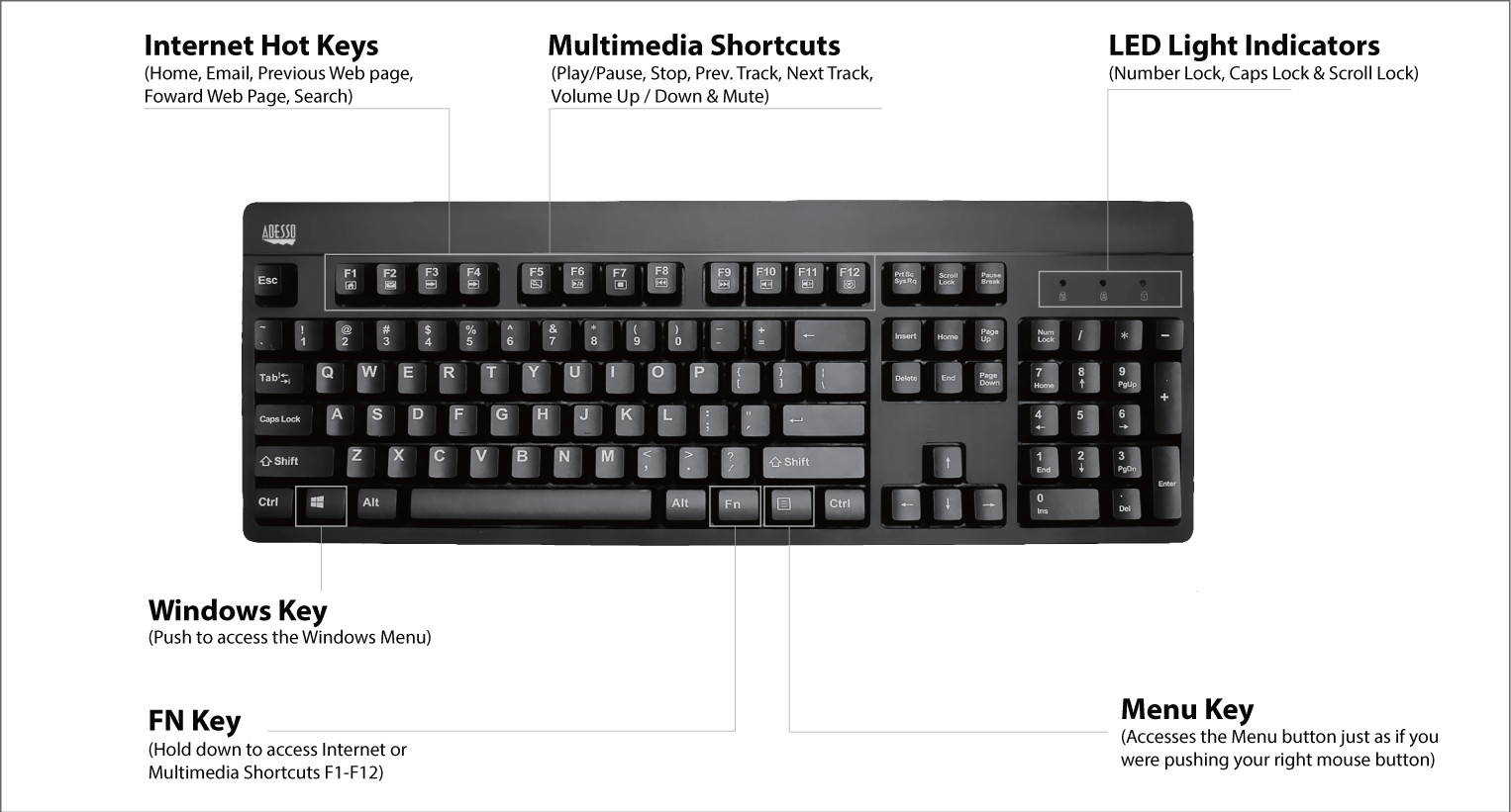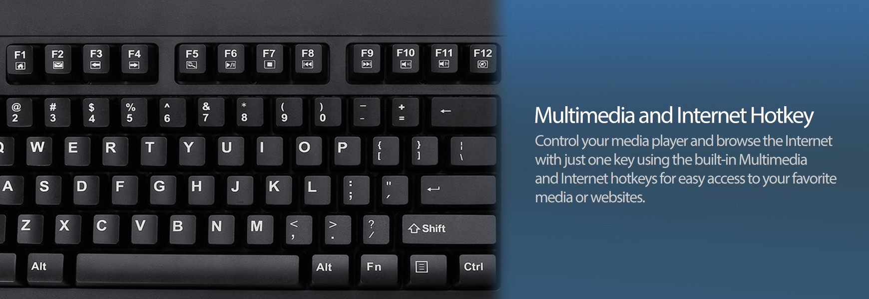 Control your media player and browse the internet with just one key using the built-in Multimedia and Internet hotkeys for easy access to your favorite media or websites.