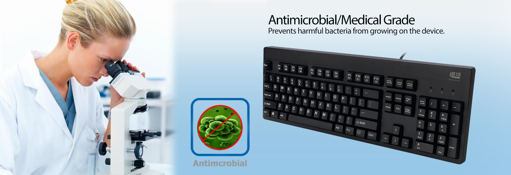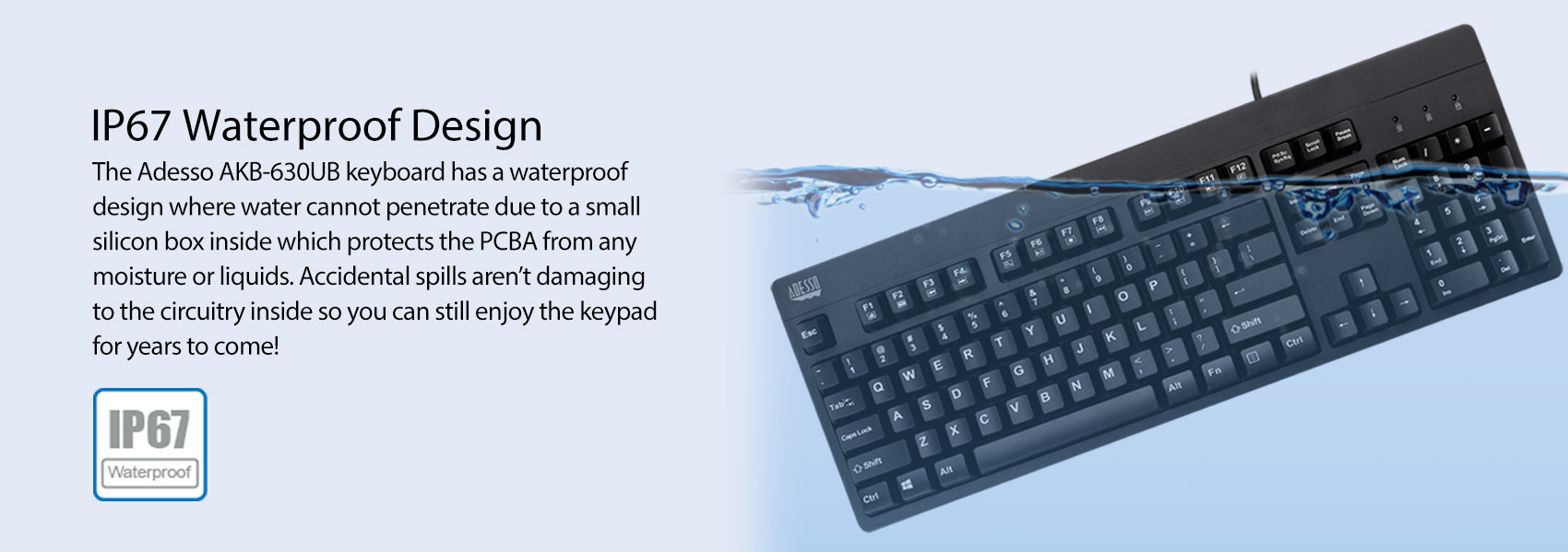 IP67 Rated. Since the circuit board inside is sealed with a plastic material, this Adesso Antimicrobial Waterproof Keyboard is 100% waterproof and can be cleaned with soap and water or other liquids cleaners. Ranked as a IP-67 Waterproof Standard, this device can withstand being submerged in water for up to 30 min up to a 3 ft depth.