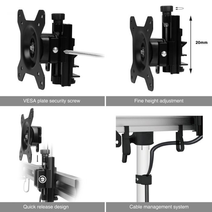 Supports VESA plate fine-tune height adjustment up to 20mm to keep monitors aligned