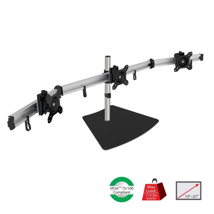 Supports monitors from 13” to 27” in size with weight load capacity up to 17.6lbs each