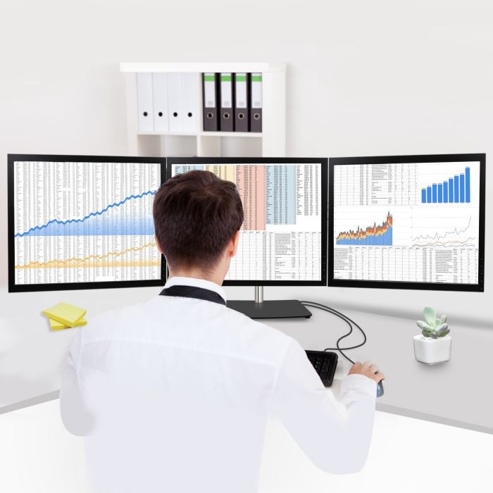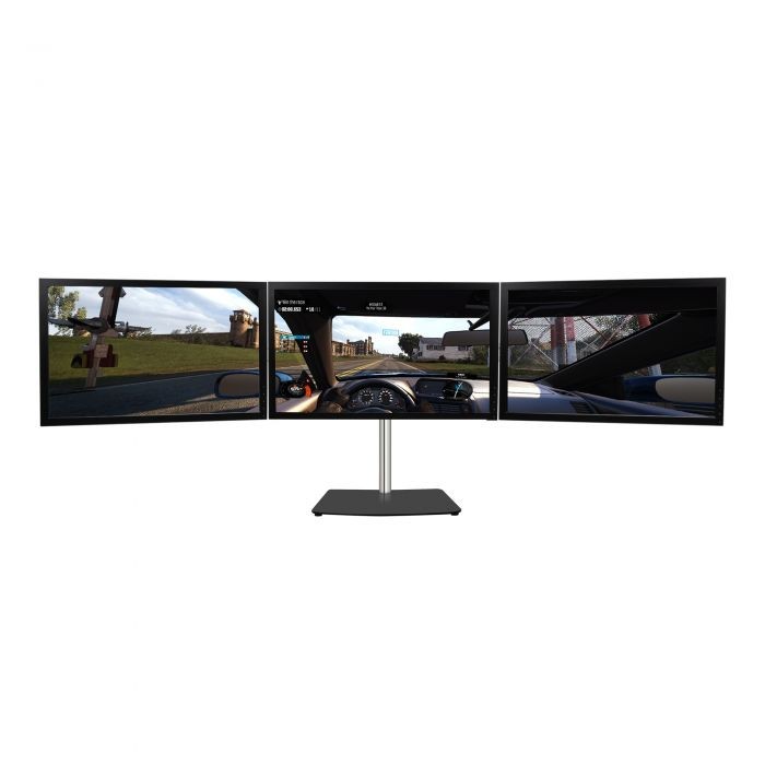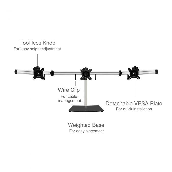 Premium side-by-side triple monitor desk stand conserves valuable desk space