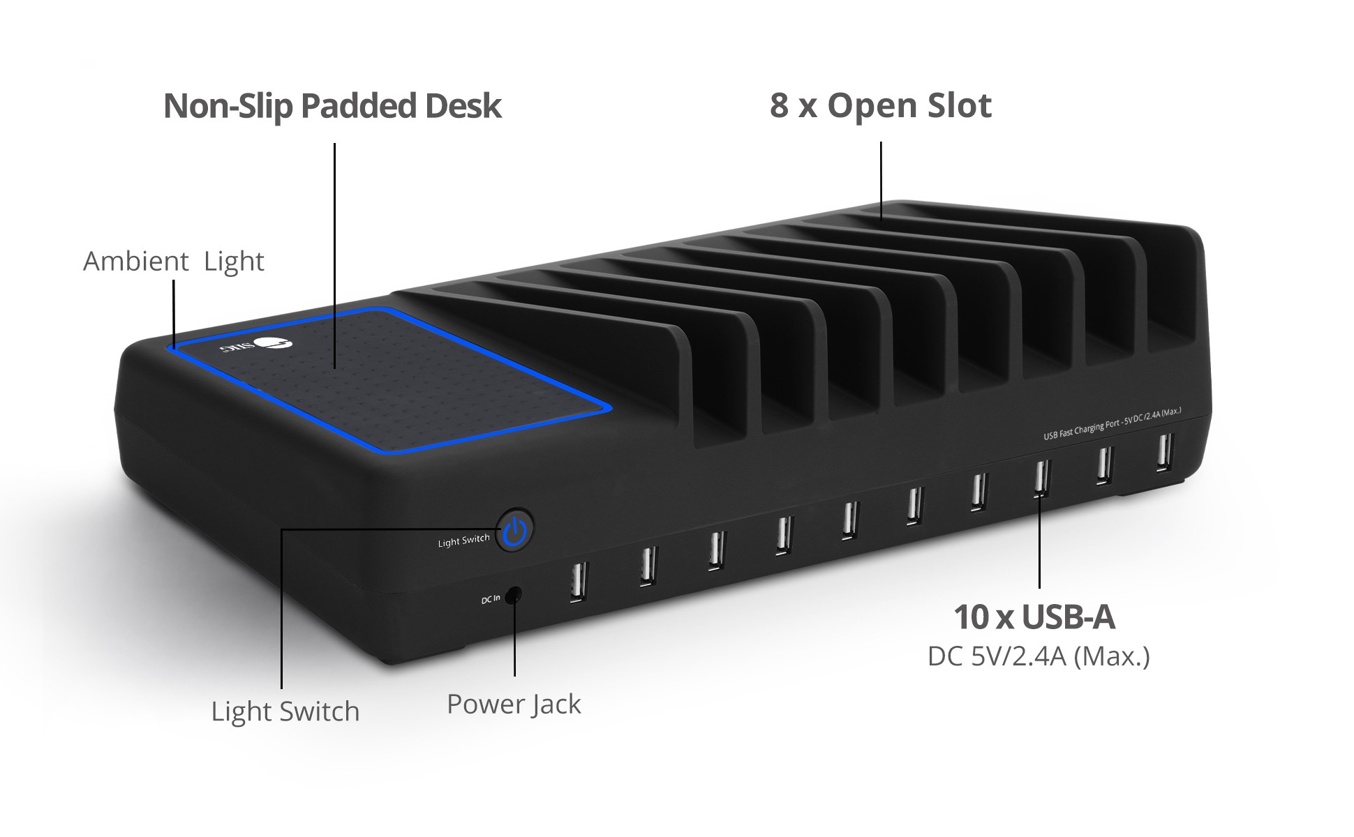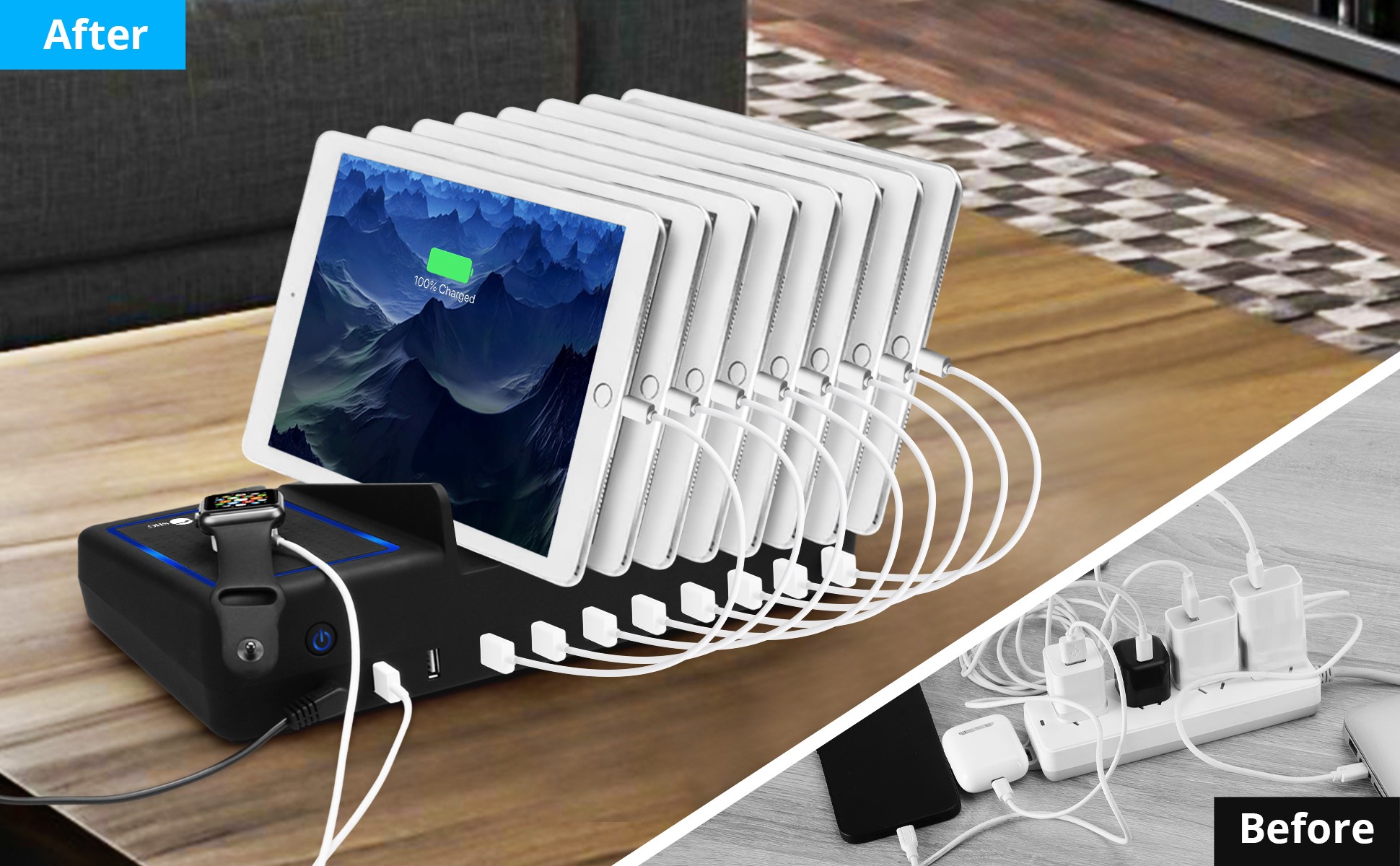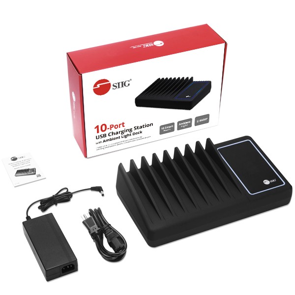 Imagine running into the issue where there's no room on your light stand for your teacup because iPad, smartphones, and other mobile devices are taking up space while charging, not to mention the cluttered space. SIIG's 10 Port Charing Station helps eliminate the issue. You never have to wake up in the morning with an uncharged device!