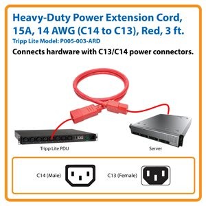 Tripp Lite’s P005-003-ARD 14 AWG Heavy-Duty Power Extension Cord is designed for data center and server room applications that require a higher gauge cable. With a C14 male connector on one end and a C13 female connector on the other, you can use it to power a computer, printer, scanner or monitor, or to attach a high-voltage server or drive to a UPS system or PDU. It’s also the perfect replacement for an old or lost cord.