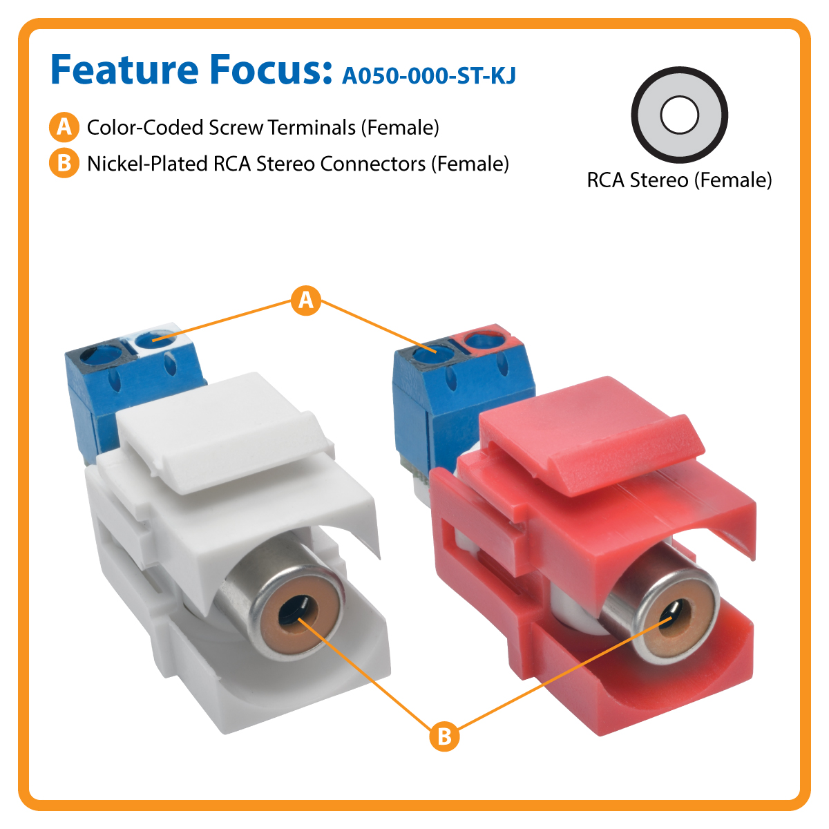 Tripp Lite’s A050-000-ST-KJ RCA Female Audio to Screw Terminal Keystone Jack Kit includes two color-coded RCA stereo audio jacks that snap easily into wall plate or patch panel cutouts. Color-coded screw terminals allow you to complete your installation in a matter of minutes, with no special tools or soldering required. The A050-000-ST-KJ is compatible with 18 to 30 AWG speaker wire and works with most universal keystone wall plates and patch panels.