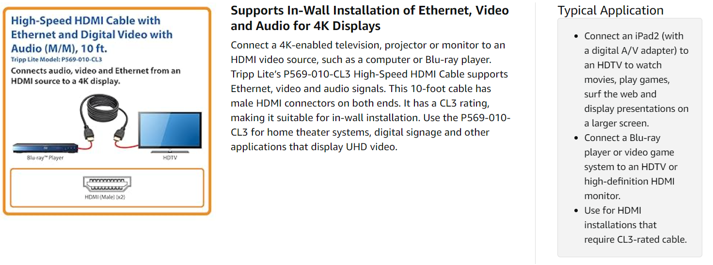 The P569-010-CL3 supports 3D video and UHD video resolutions up to 3840 x 2160 (4K x 2K). It can successfully transmit 1080p signals at increased color depths and refresh rates. This cable transfers data at speeds up to 18 Gbps. It’s backward compatible with previous HDMI generations. You can also use the P569-010-CL3 with an Apple