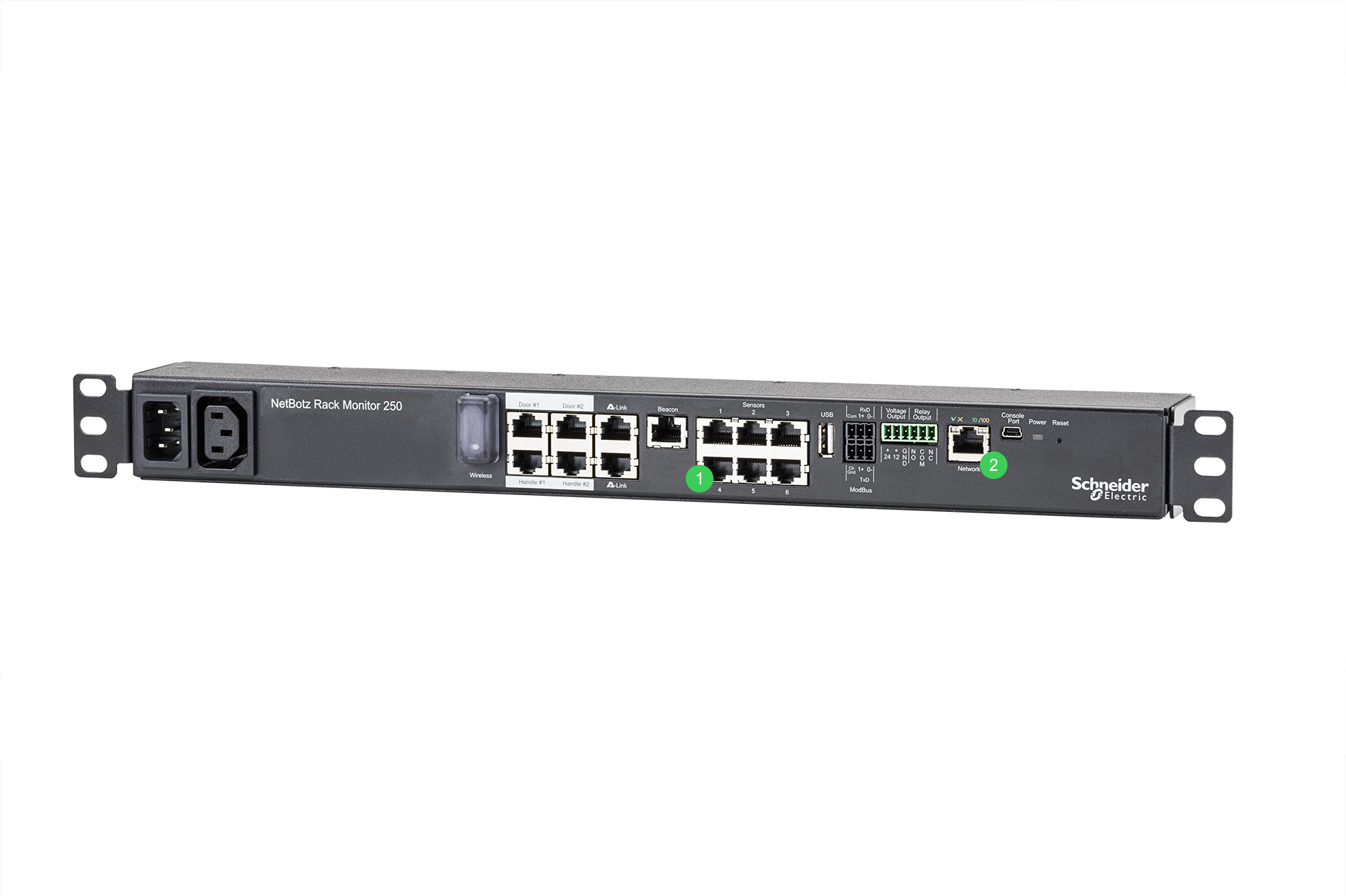 A4. APC NetBotz 250 comes with temperature & humidity sensor as well as rack access handles for 2 rack doors.