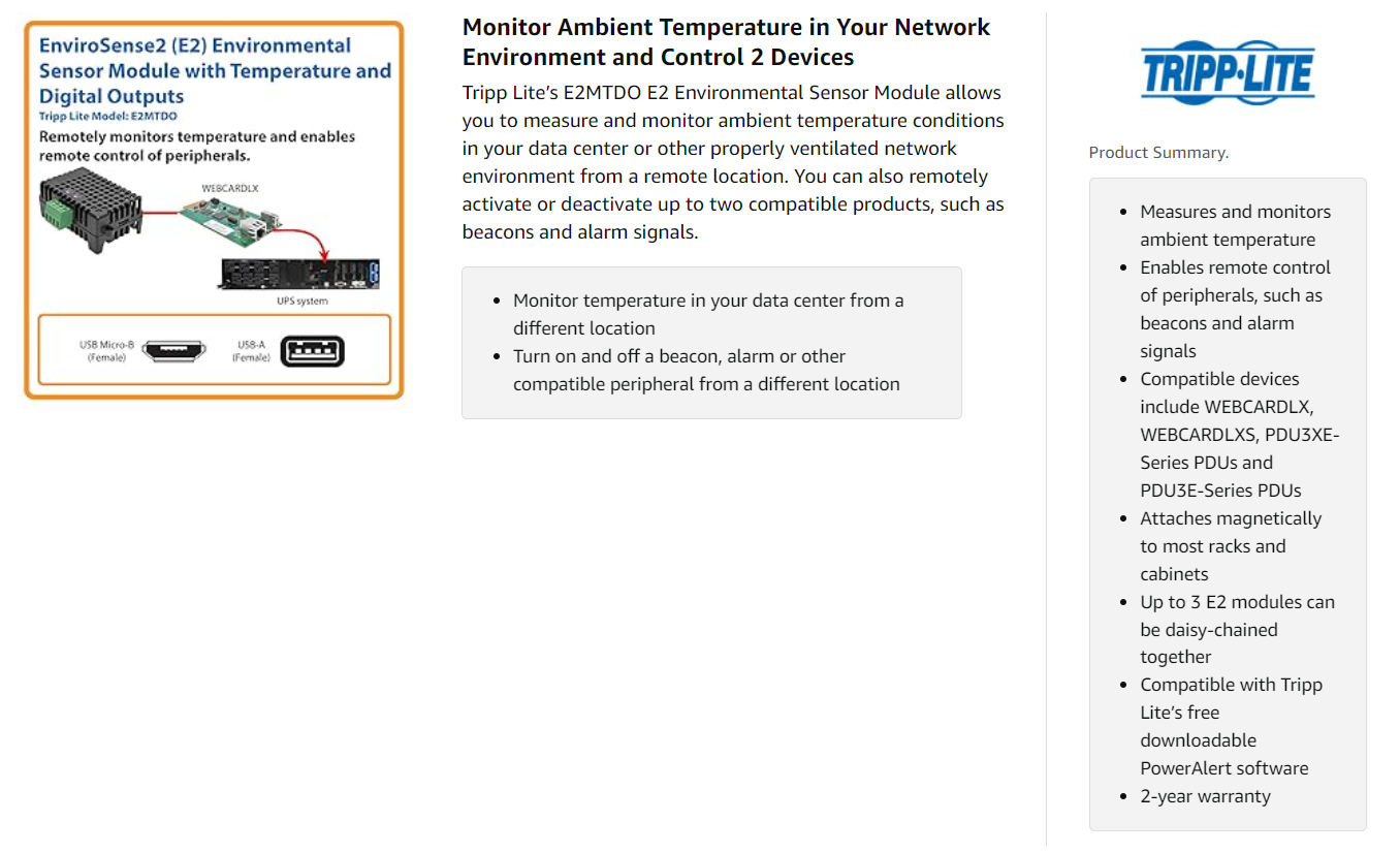 The E2MTDO comes with a 2-year warranty. It’s manufactured in compliance with strict RoHS specifications, reflecting Tripp Lite’s commitment to environmental responsibility.
