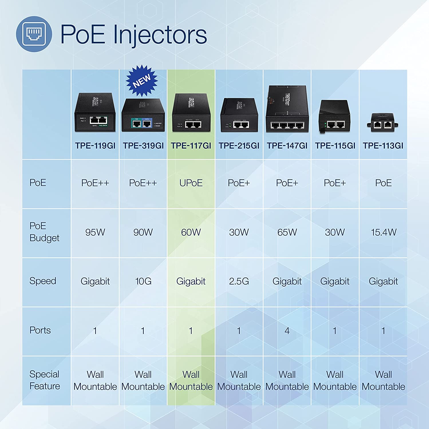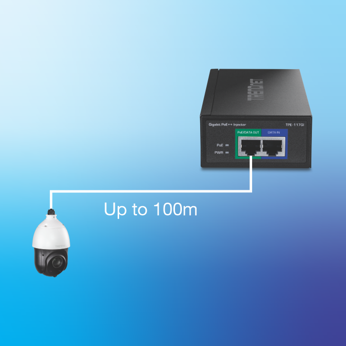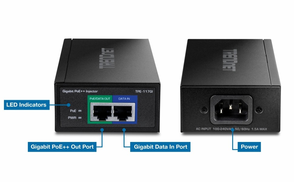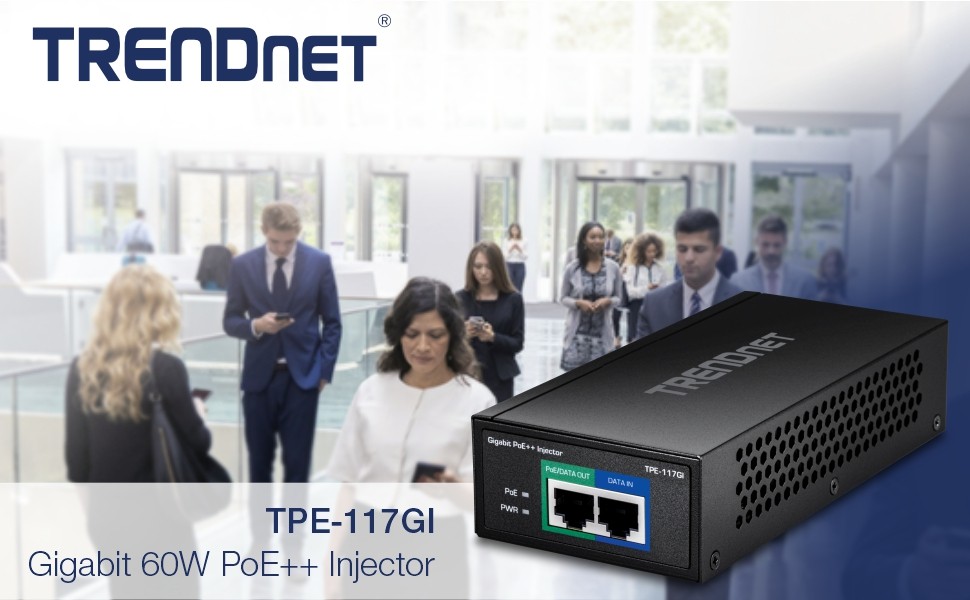 TRENDnet’s Gigabit 60W PoE++ Injector, model TPE-117GI, combines electrical power with a gigabit network connection to produce a gigabit PoE++ signal. Auto-sensing technology conveniently delivers the correct wattage needed to power your PoE devices. Use an existing open port from a non-PoE switch to save installation and equipment costs when installing PoE access points and IP cameras.