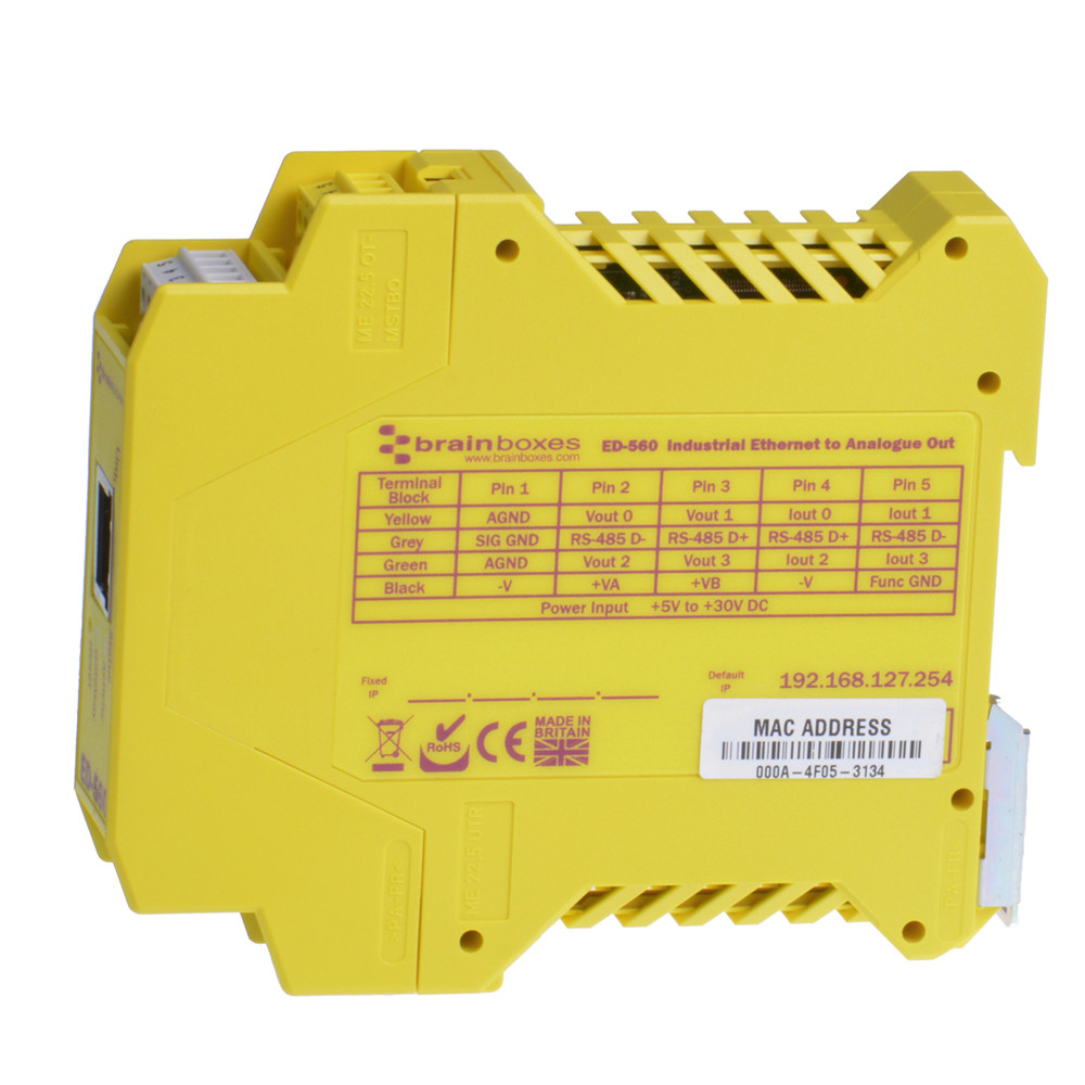 As well as the popular 0-10V and 4-20mA outputs, the ED-560 allows full scale signals as small as ±75mV to be resolved to 12 bit accuracy across 4 analogue outputs. Each channel is individually configurable for voltage or current output with its own programmable gain.