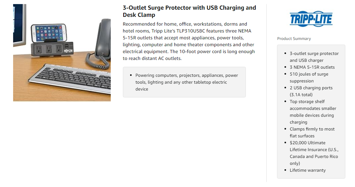 The TLP310USBC comes with a lifetime warranty and Ultimate Lifetime Insurance for any connected components damaged by a power surge (U.S., Canada and Puerto Rico only). It’s manufactured in compliance with strict RoHS specifications, reflecting Tripp Lite’s commitment to environmental responsibility.