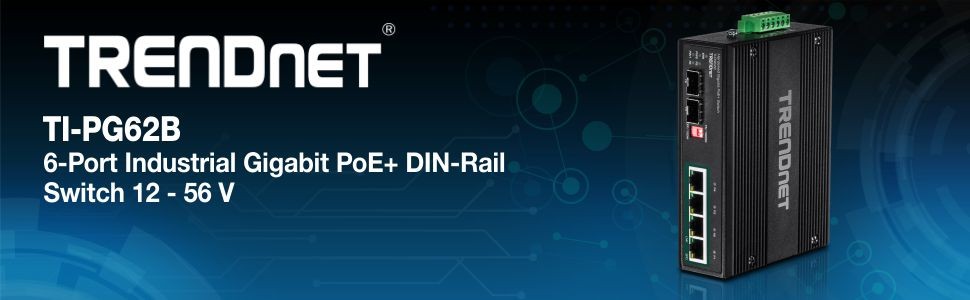 TRENDnet’s 6-Port Industrial Gigabit PoE+ DIN-Rail Switch, model TI-PG62B, is an industrial variable voltage switch with four gigabit PoE+ ports, a 120W PoE power budget, and two dedicated SFP slots. Users are able to connect four PoE+ devices and two SFP modules to this industrial variable voltage PoE+ switch with a 12Gbps switching capacity for high-speed connectivity to the network. The industrial variable voltage PoE+ switch is equipped with a rugged IP30 rated metal enclosure, and designed to withstand a high degree of vibration and shock, while operating within a wide temperature range of -40° – 75° C (-40° – 167° F) for industrial environments. Dual 12 – 55V DC power inputs on the industrial variable voltage switch provide redundancy with power failure alarm relay.
