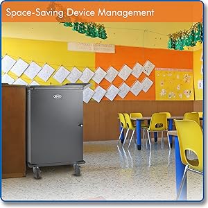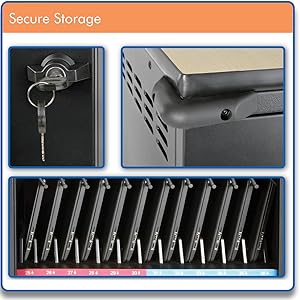 Comprehensive Protection for Mobile DevicesThoughtful details take the worry out of storing expensive devices. - 3-point metal locks secure separate compartments for devices and power adapters. - Powder-coated steel cabinet has corner safety bumpers. - Protective shelf finish helps prevent device scratches. - Flow-through ventilation moderates temperatures. |