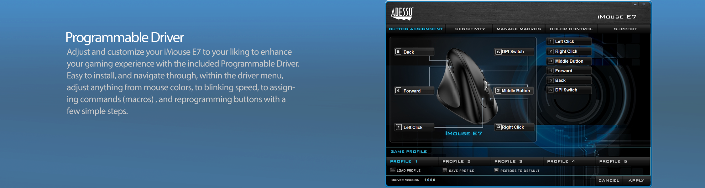 Adjust and customize your iMouse E7 to your liking to enhance your gaming experience with the included Programmable Driver. Easy to install, and navigate through, within the driver menu, adjust anything from mouse colors, to blinking speed, to assigning commands (macros) , and reprogramming buttons with a few simple steps.
