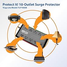 Tripp Lite’s Protect it! TLP1006B Surge Protector protects sensitive electronics against damaging surges, spikes and line noise, and is perfect for home offices, workstations, dorms and hotel rooms.