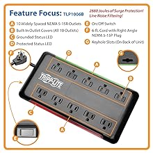 With the TLP1006B, you get superior performance plus peace of mind. We’re so confident of its quality that we warrant it to be free from defects in material and workmanship for life! It also comes with Ultimate Lifetime Insurance (US, Canada and Puerto Rico only) for any connected components damaged by a power surge. And because Tripp is committed to environmental responsibility, it’s manufactured in compliance with strict RoHS specifications.