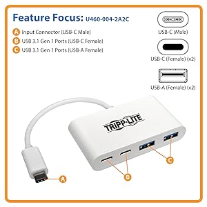 Newer tablets, laptops, Chromebook and MacBook notebooks and even desktop computers often have one or more USB-C (USB Type-C) ports, but come equipped with few others. Tripp Lite’s portable USB-C multiport hub expands the functionality of the USB-C (or Thunderbolt 3) port on your device and makes it compatible with your existing equipment. From a single USB-C port, you can:
